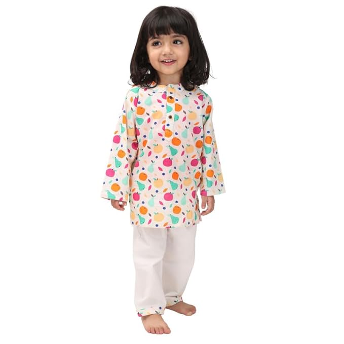 Mama & Peaches Tropical Fruits Kurta Set for Kids | Premium Cotton Fabric | Stylish Printed Design | Button Fly Closure | Mandarin Neckline | Perfect for Festivals and Everyday Wear