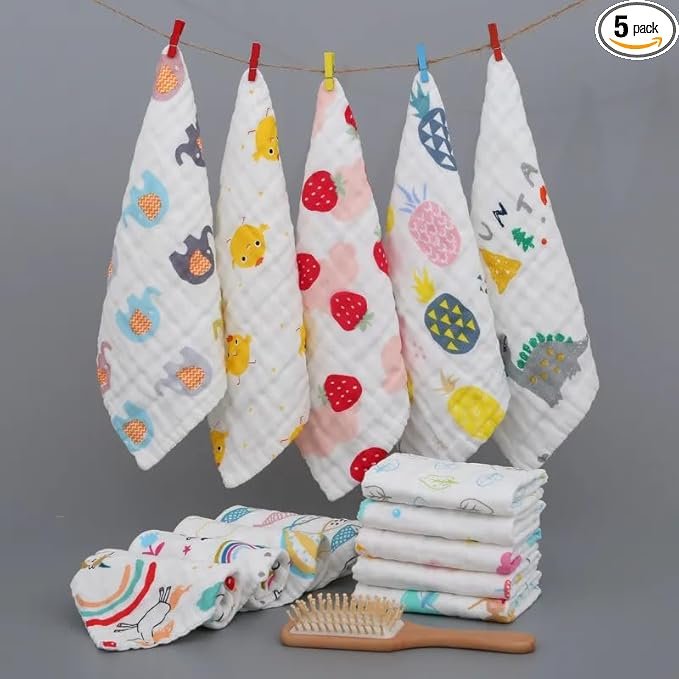 Package includes : 5 pcs Soft Muslin 6 Layer Cotton White Printed Hankies/Napkins with cute attractive prints.Size: L-24cm,B-24cm in 6 layers.